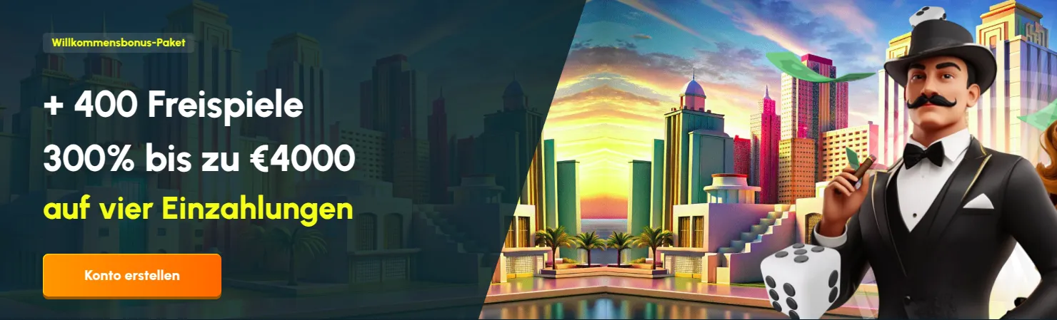 Willkommensbonus-Paket 300% bis zu 4.000 EUR + 400 Freispiele auf Ihre ersten vier Einzahlungen